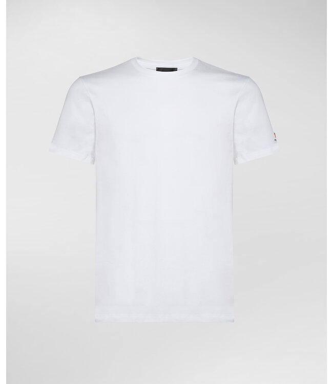 T-shirt van stretchkatoen met ronde hals en kleine logoprint op de linkermouw. Een klassiek, iconisch, veelzijdig stuk, heel gemakkelijk te combineren. Zacht en koel om aan te raken, kan alleen worden gebruikt of onder een trui of sweatshirt. Kleedt slank af.