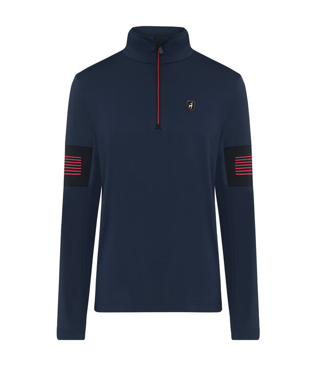 De functionele jersey, gemaakt in Frankrijk, is licht, ademend, sneldrogend en biedt een hoge bewegingsvrijheid. Kleurcontrasterende inzetstukken, rubberen details en een tweekleurige YKK-rits geven deze Toni Sailer-basislaag een sportieve race-look die perfect past bij de ALLAN-ski-jas.